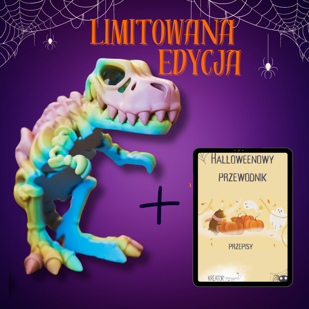 Limitowana edycja Halloween: E-book – przewodnik halloweenowy oraz wydrukowany w 3D szkielet T-Rexa to doskonałe połączenie dla miłośników zabawy i nauki. E-book zawiera 17 kulinarnych inspiracji, 9 dekoracji i zabaw do samodzielnego wykonania, gry towarzyskie oraz karty pracy do wydruku, które ułatwią organizację halloweenowej imprezy zarówno dla najmłodszych, jak i tych trochę starszych.