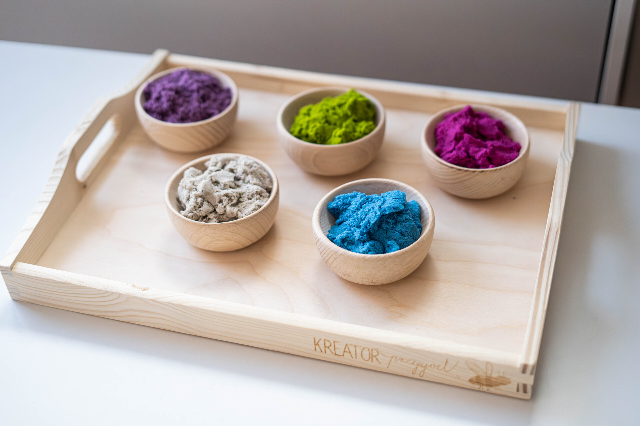 pięć kolorów piasku dynamicznego ułożone na drewnianej tacy