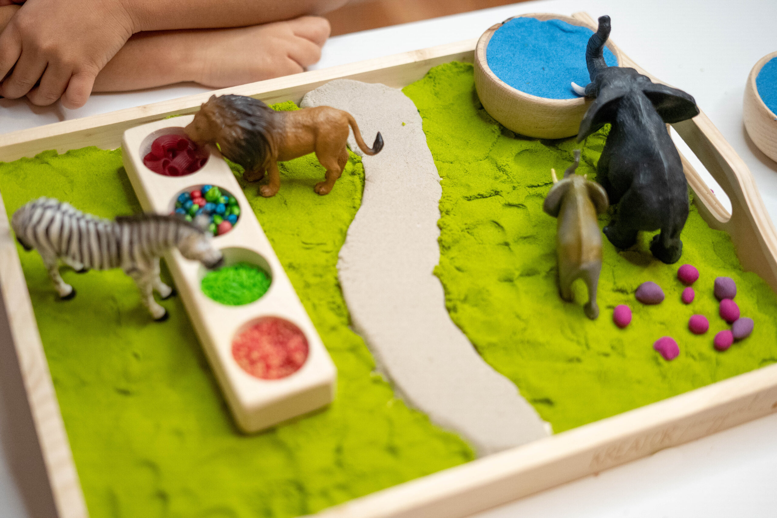 Piasek dynamiczny to materiał o wyjątkowej konsystencji– lekki i miękki. Zachowuje wilgotność, dzięki czemu łatwo się formuje, ale nie przykleja do rąk ani ich nie brudzi. W połączeniu z drewnianymi akcesoriami z zestawu pozwala na wszechstronną i kreatywną zabawę. Prostokątna taca o wymiarach 30 x 40 cm pomaga utrzymać porządek, ograniczając przestrzeń do zabawy.