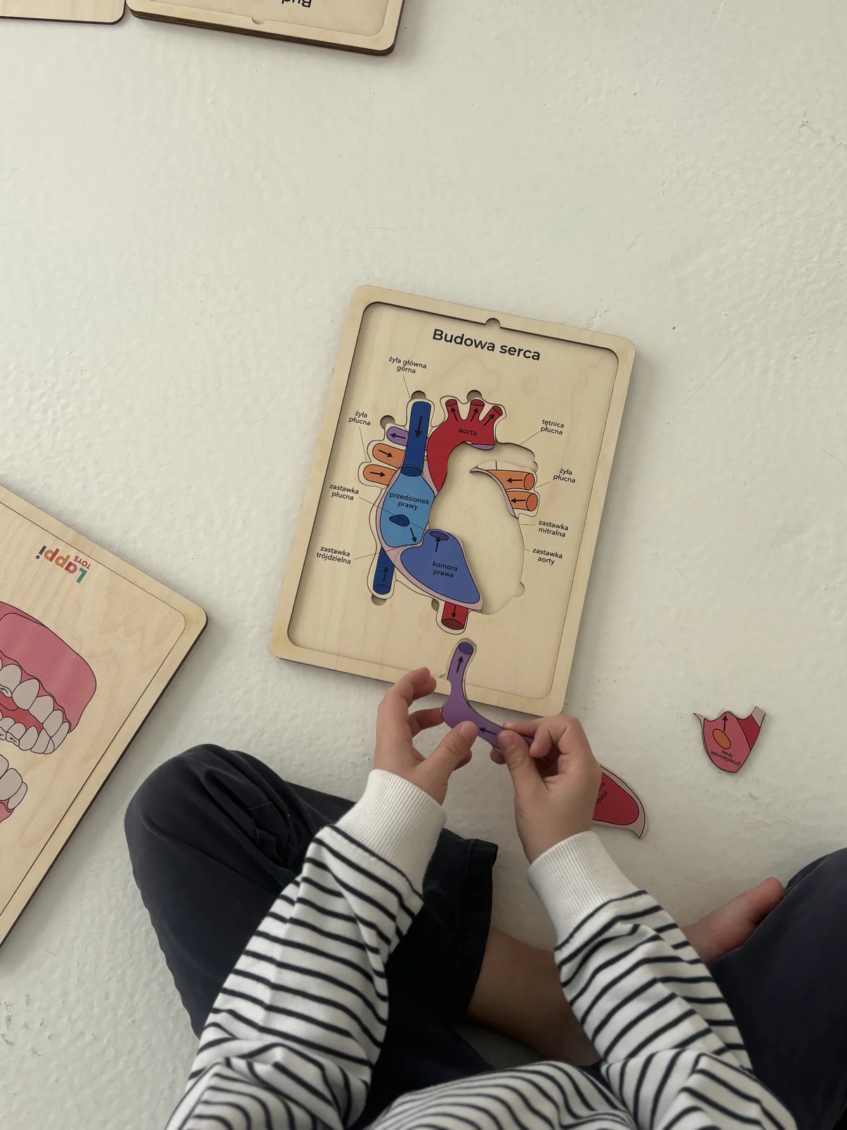Zestaw 7 drewnianych układanek edukacyjnych to wyjątkowa pomoc dydaktyczna dla dzieci, które chcą odkrywać tajemnice anatomii człowieka. Każda układanka przedstawia jeden z kluczowych narządów: serce, płuca, oko, ząb, mózg, skóra i ucho a także zawiera opisy ich najważniejszych części, co wspiera edukację biologiczną i rozwój logicznego myślenia.