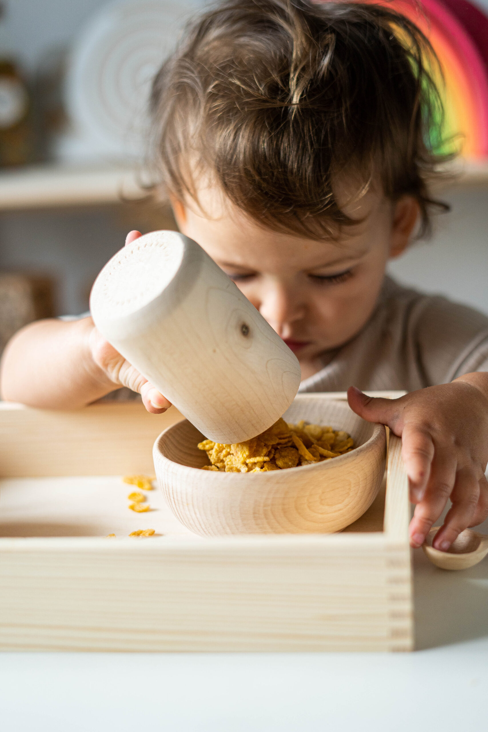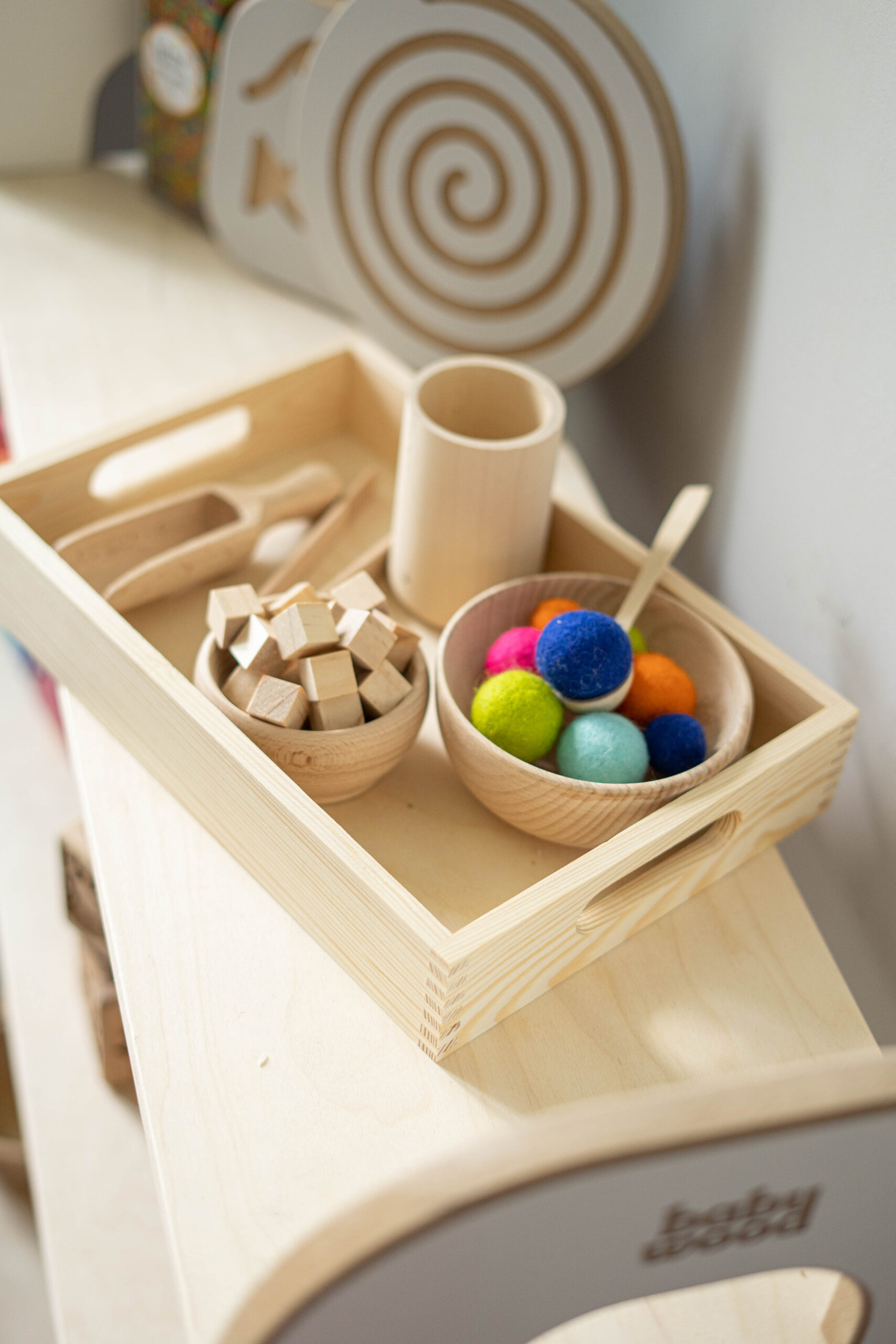 • Drewniana taca (20×30 cm): Wyznacza przestrzeń do zabawy, ułatwia skupienie i pomaga zachować porządek