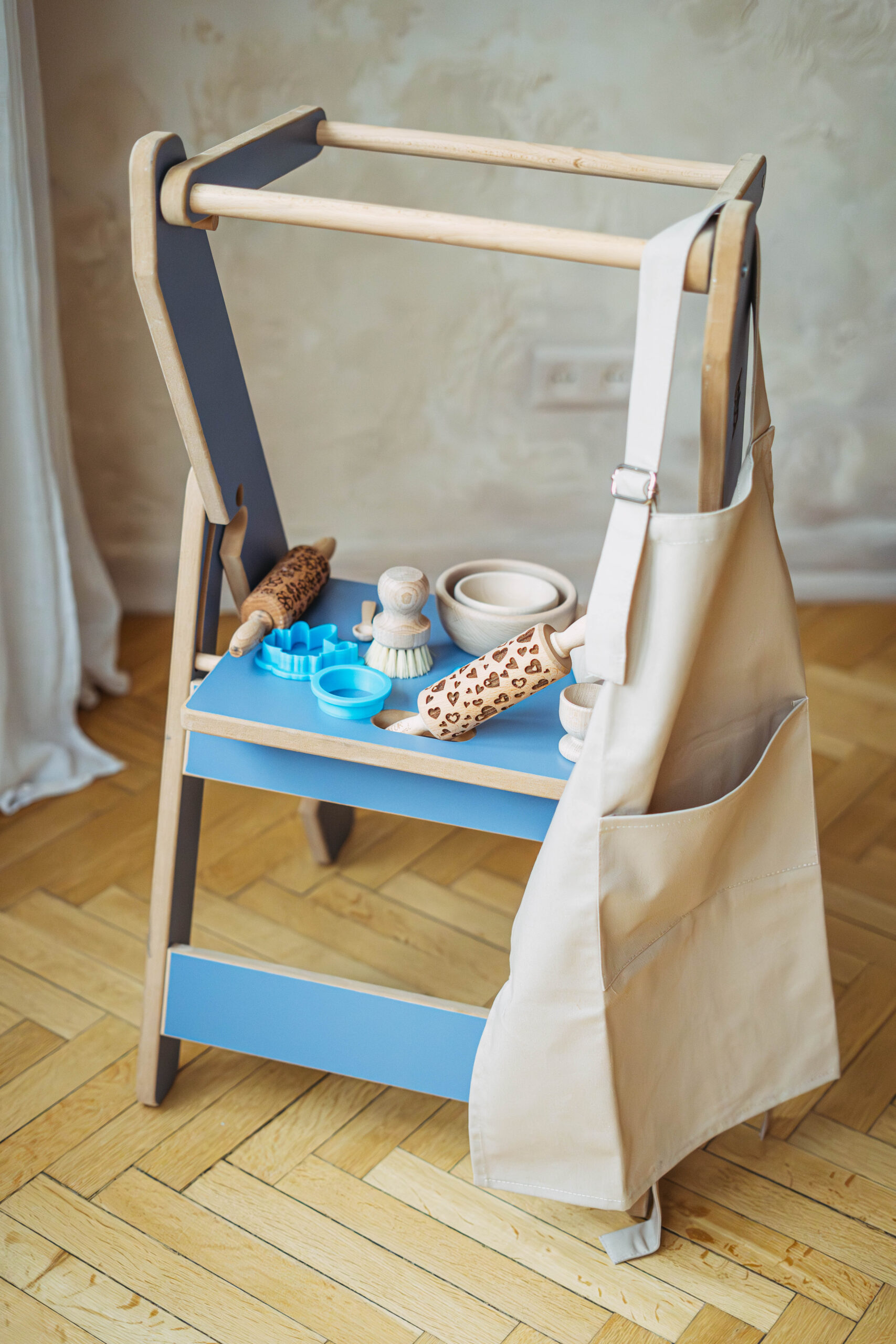Dostępny w sześciu pięknych kolorach (naturalny, biały, czarny, szary, oliwkowy, błękitny), Kitchen Helper nie tylko wzbogaci wygląd Twojej kuchni, ale także pozwoli Twojemu dziecku na swobodne odkrywanie świata gotowania.
